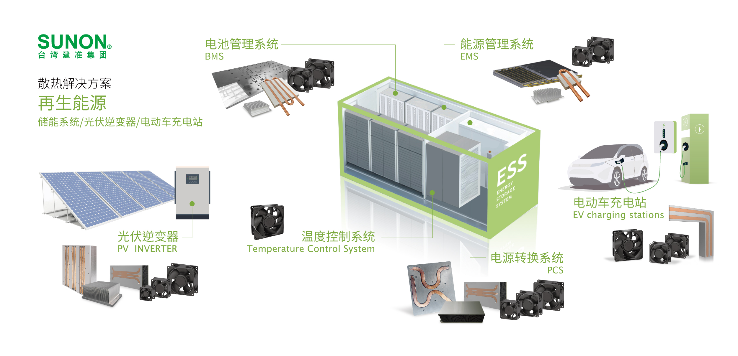 SUNON 提供完整的散熱風(fēng)扇與散熱模組產(chǎn)品。高防護(hù)系列GF/PF 風(fēng)扇提供高效能散熱與兼具防塵防水IP68 最高等級與GR487耐鹽霧等防護(hù)功能;客制化水冷模組及完整的技術(shù)評估服務(wù),快速提供客戶最適化散熱解決方案,滿足惡劣環(huán)境下運作的EV充電系統(tǒng)、ESS 儲能系統(tǒng)、太陽能PV逆變器等再生能源系統(tǒng)使用。